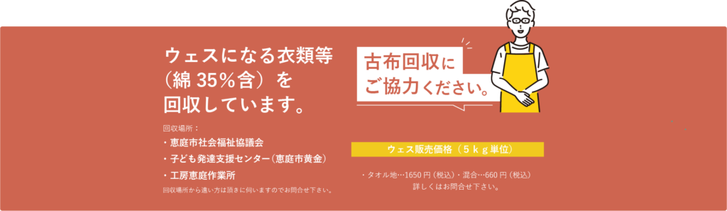 刺し子花ふきんや花ぞうり、ウェスの製作販売のほか、建設部材の検査・袋詰め・梱包作業を行っています。また、羊毛洗浄や軽作業にも取り組んでいます。
